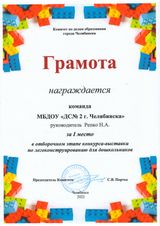 16 декабря 2022 года состоялся городской конкурс-выставка по легоконструированию для дошкольников города Челябинска. Нашей команде воспитанников "Академия добра" была представлена возможность выступить с проектом на тему: "Доброград - город добрых дел". По результатам конкурса ребятам была вручена грамота Комитета по делам образования города Челябинска за участие в городском конкурсе. Ранее 24 ноября 2022 на отборочном этапе конкурса команда заняла 1 место среди команд Ленинского района.